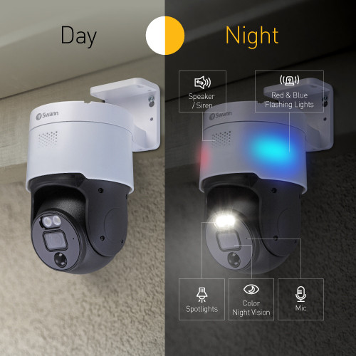 The 4K Pan & Tilt NVR Security Cameras are at the pinnacle of feature-packed crime-deterring security devices. With bright spotlights, red & blue flashing lights, two-way audio and loud siren, you can intimidate intruders and prevent unwanted activity, and these features are controllable remotely in the Swann Security app. The powerful digital zoom lets you zoom in to capture details essential for evidence.
