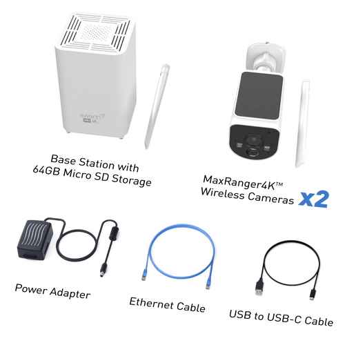 MaxRanger4K Base Station with 64GB SD Card Storage 2 x MaxRanger4K MAXV2CAM Wireless Cameras 2 x Outdoor Mounting Stands Power Adapter Ethernet Cable USB to USB-C Charging Cable Mounting Screws & Plugs Operating Instructions