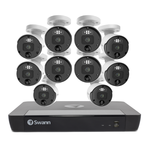 Enhance your security with Swann’s 10 Camera 16 Channel 12MP Professional NVR Security System. This system delivers ultra-clear 12MP resolution, True Detect™ heat and motion-sensing technology, Night2Day™ color night vision, and two-way audio. Equipped with a 4TB HDD, it provides extensive storage. The system includes red and blue flashing lights, spotlights, and a loud siren for enhanced deterrence. Manage and access footage remotely via the Swann Security App.