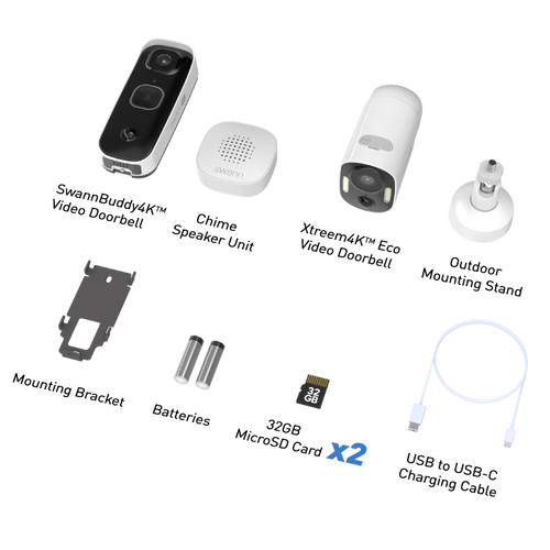 Xtreem4K Security Camera Outdoor Stand SwannBuddy4K Doorbell Chime Speaker Unit 32GB Micro SD Card x 2 USB to USB-C Charging Cable Mounting Bracket AA Batteries x 2 (for Chime Unit) Mounting Screws & Hardware Operating Instructions