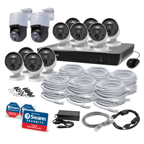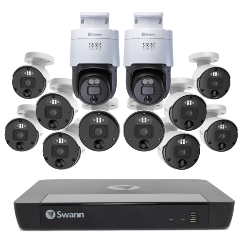 Elevate your security with Swann’s 12 Camera 16 Channel 12MP Professional NVR Security System. This system delivers exceptional 12MP resolution, True Detect™ heat and motion-sensing technology, Night2Day™ color night vision, and two-way audio. With a 4TB HDD, it offers extensive storage. The system includes 10 bullet cameras and 2 pan-tilt cameras, equipped with spotlights, sirens, and sensor warning lights for enhanced deterrence. Manage and access footage remotely via the Swann Security App.