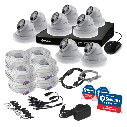 8 Channel DVR with 1TB Hard Drive 1080p Dome Cameras x 8 Extension Cables 18m x 8 Ethernet Cable HDMI Cable Power Adapters & Splitters Mouse Mounting Screws & Plugs Quick Start Guide Theft Deterrent Stickers