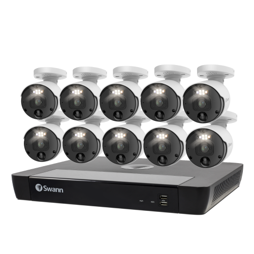 Enhance your security with Swann’s 10 Camera 16 Channel 12MP Professional NVR Security System. This system delivers ultra-clear 12MP resolution, True Detect™ heat and motion-sensing technology, Night2Day™ color night vision, and two-way audio. Equipped with a 4TB HDD, it provides extensive storage. The system includes red and blue flashing lights, spotlights, and a loud siren for enhanced deterrence. Manage and access footage remotely via the Swann Security App.
