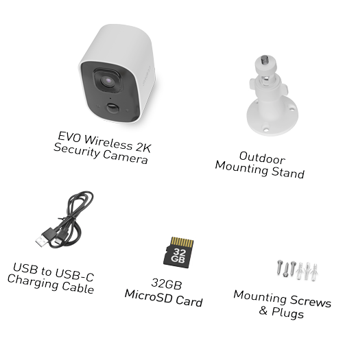 EVO Wireless Camera (with 32GB MicroSD card) Camera Mount USB to USB-C Charging Cable Mounting Screws & Hardware Operating Instructions