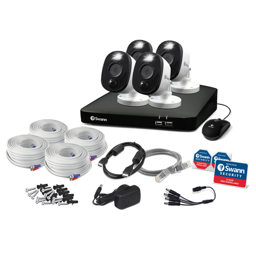 DVR 4680 8 Channel DVR with 1TB Hard Drive PRO-1080MSFB Sensor Warning Light Security Cameras x 4 BNC Cables 60ft / 18m x 4 Ethernet Cable HDMI Cable Power Adapter & Splitter Mouse Mounting Screws & Plugs Quick Start Guide Theft Deterrent Stickers