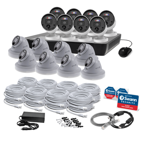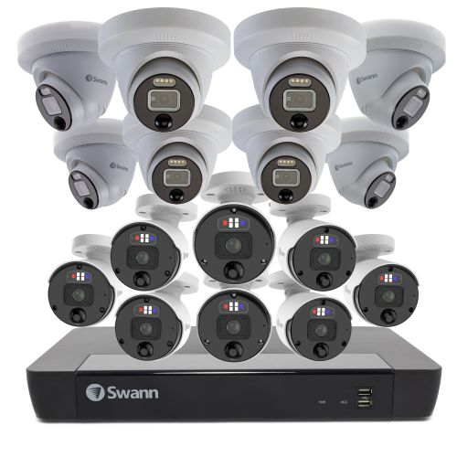 Ensure comprehensive security with Swann’s 16 Camera 16 Channel 4K Ultra HD Professional NVR Security System. This system offers exceptional 4K resolution, True Detect™ heat and motion-sensing technology, Night2Day™ color night vision, and two-way audio. With a massive 3TB HDD, it provides extensive storage. Equipped with spotlight cameras, siren, and sensor warning lights, it enhances deterrence. Manage and access footage remotely via the Swann Security App.